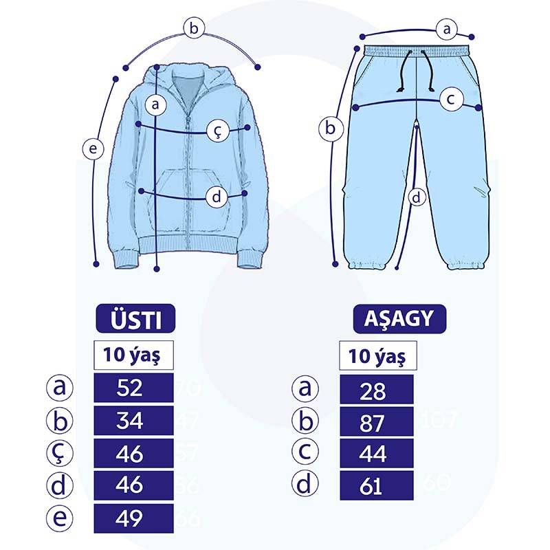 • Aýratynlyklary: Gyz çagalar üçin açyk mawy reňkli, owadan dizaýn fasonly, öňi kelte zamokly, ýumşak, jübüli we "G" ýazgyly komplekt ýyly eşik. Sowuk howada geýmek üçin örän gowy.
