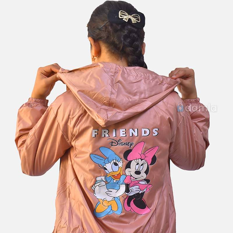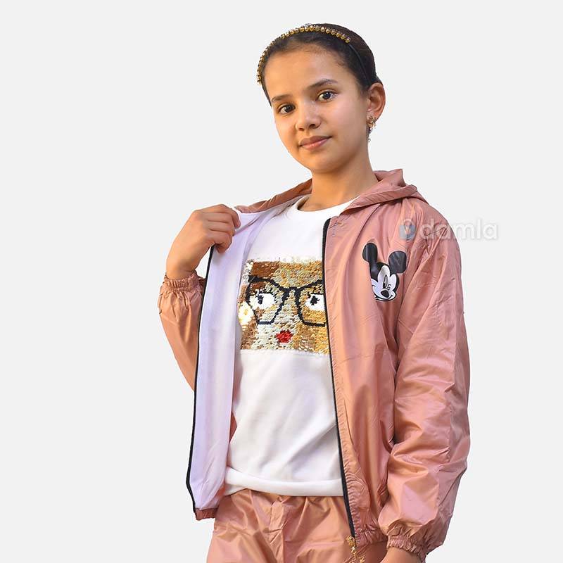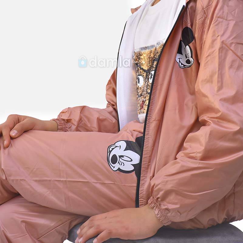 • Aýratynlyklary: Gyz çagalar üçin gülgüne reňkli, owadan dizaýn fasonly, ýumşak, zamokly, kopuşonly we öňünde Mickey Mouse şekili bolan komplekt ýyly eşik. Salkyn howada geýmek üçin örän amatly.