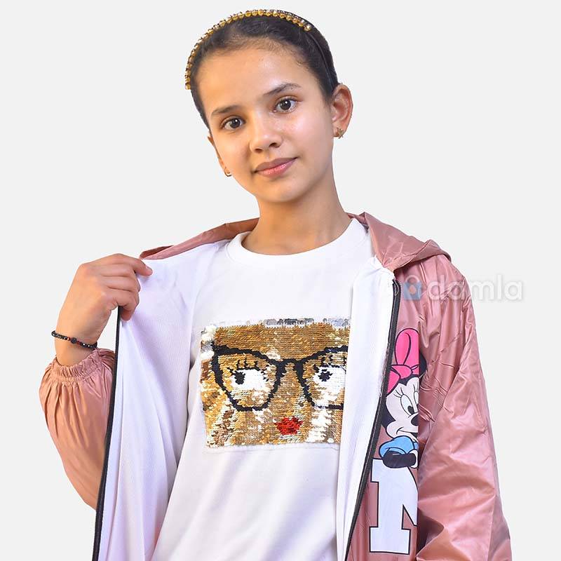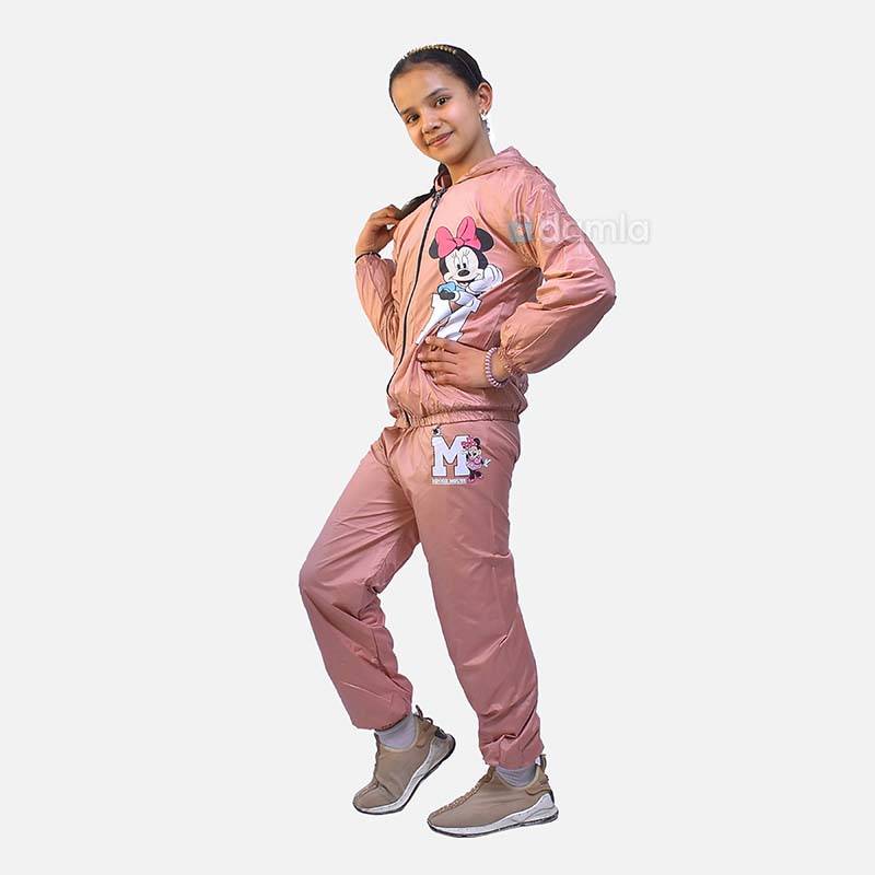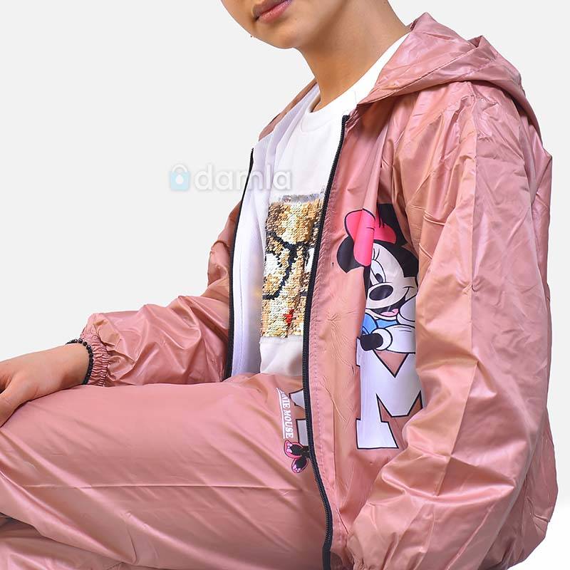 Aýratynlyklary: Gyz çagalar üçin gülgüne reňkli, owadan dizaýn fasonly, ýumşak, zamokly, kopuşonly we öňünde Mickey Mouse şekili bolan komplekt ýyly eşik. Salkyn howada geýmek üçin örän amatly.