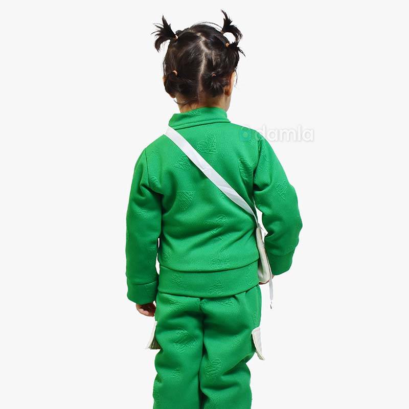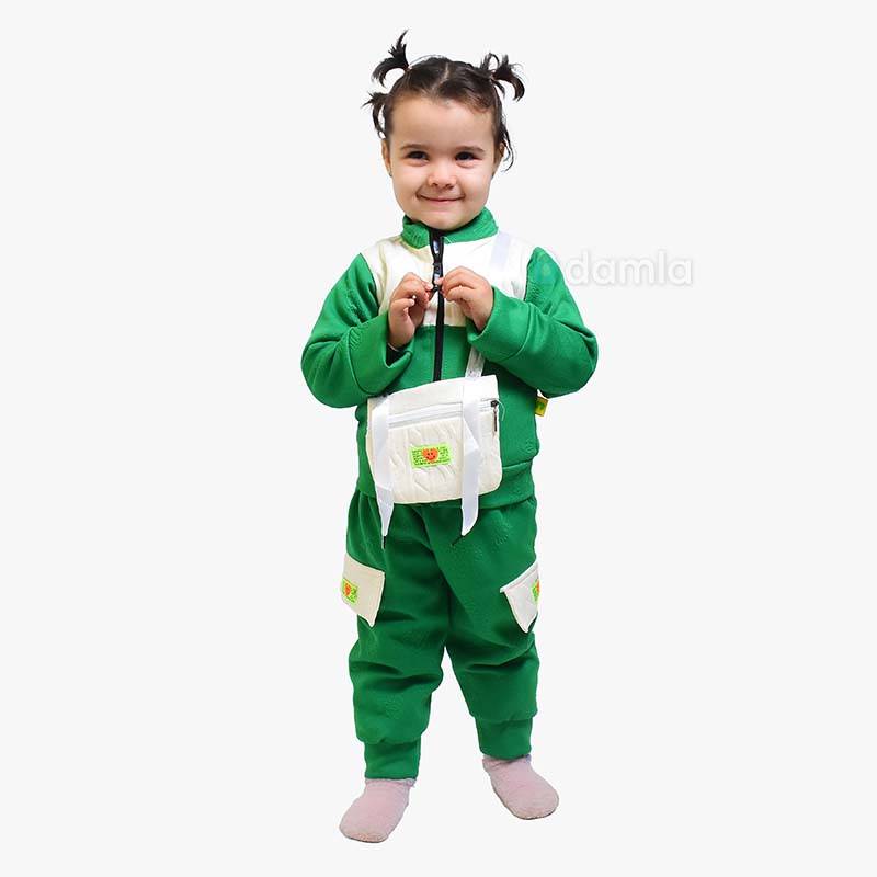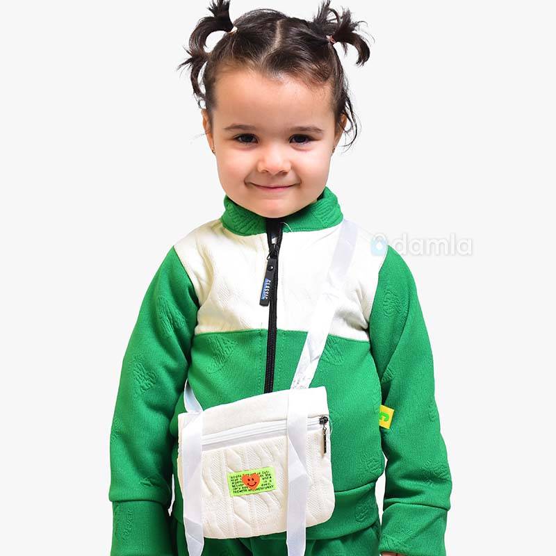 Gyz çagalar üçin süýt-ýaşyl reňkli komplekt sport eşik- çagalar üçin sowuk möwsümde ýyly we rahat oňaýly eşik bolup çagalaryň şkafynyň zerur parçasydyr. Zamokly we ýany bilen kiçi sumkasy bar. Sargytlar tassyklanandan soň 1-7 iş günüň dowamynda gowşurylar.