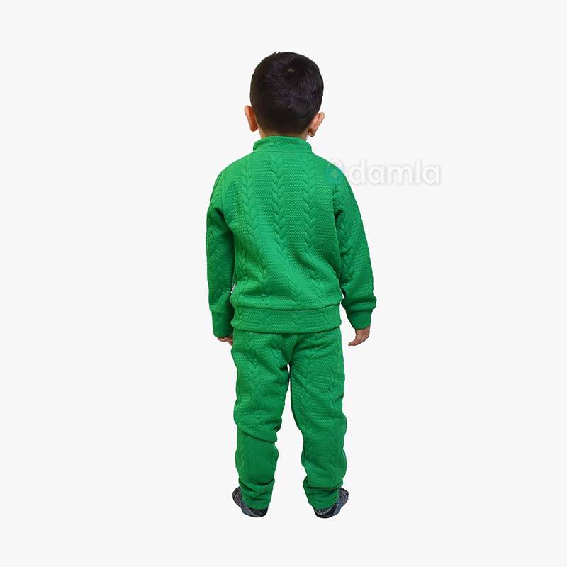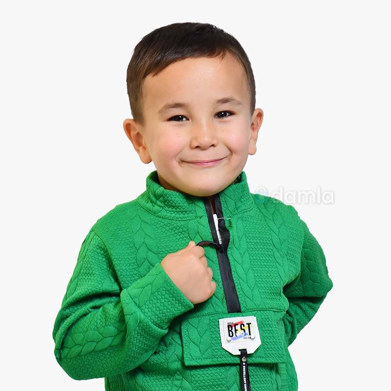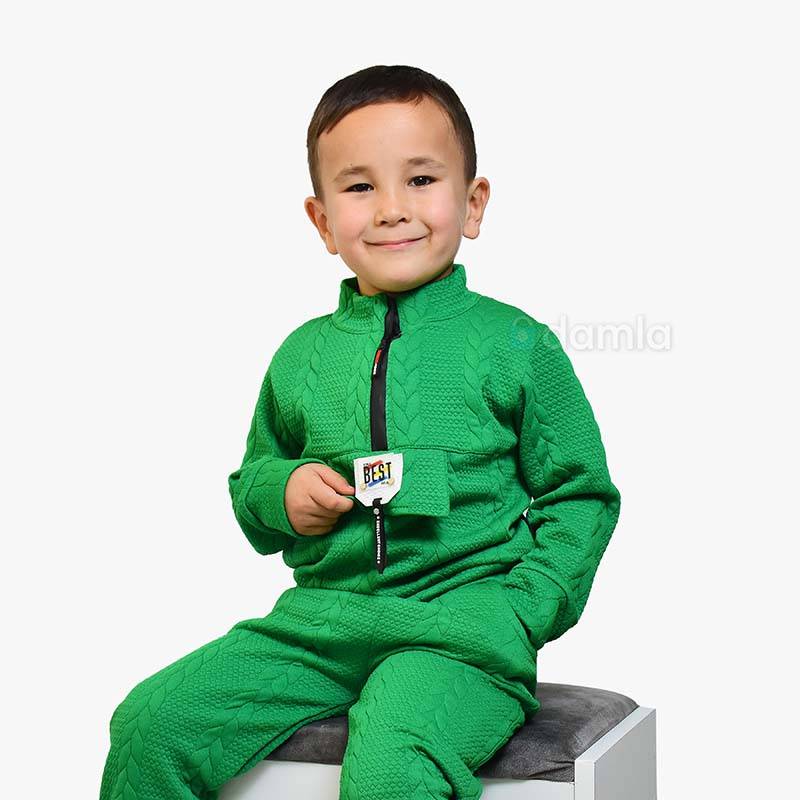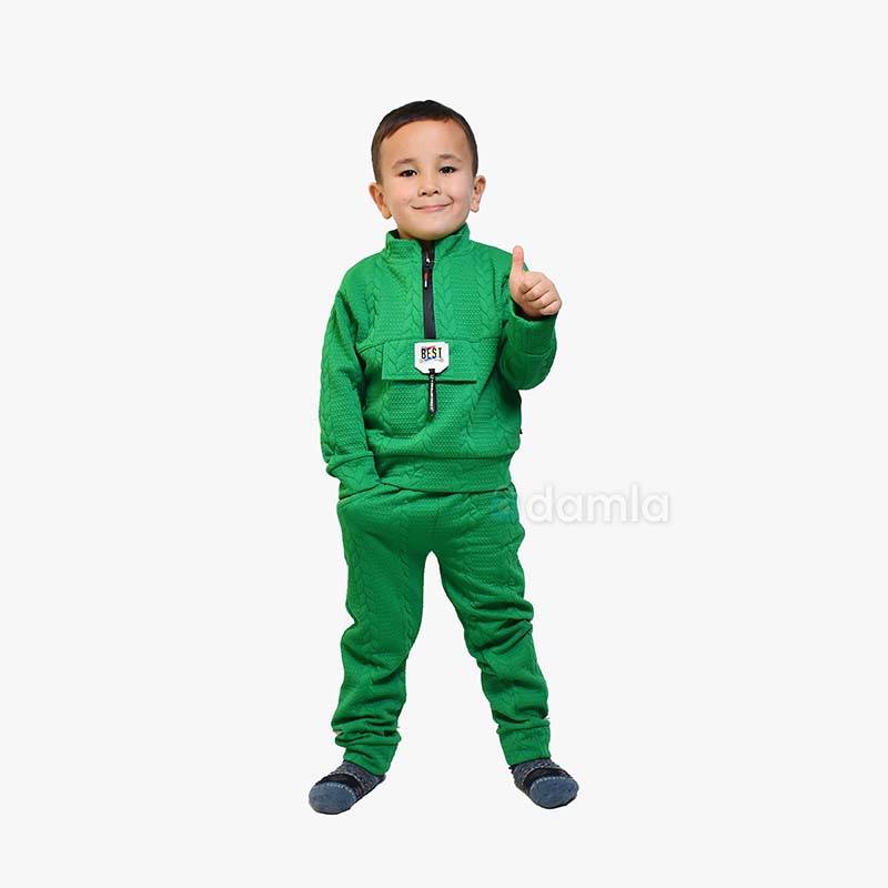 Oglan çagalar üçin ýaşyl reňkli komplekt sport eşik - ýüzündäki örülen şekiller oňa üýtgeşik dizaýn berýär, şeýle-de sowuk we salkyn howada pyýada ýörelende ýa-da sport bilen meşgullanan wagty geýmäge rahat we ýakymly bolýar. Sargytlar tassyklanandan soň 1-7 iş günüň dowamynda gowşurylar.