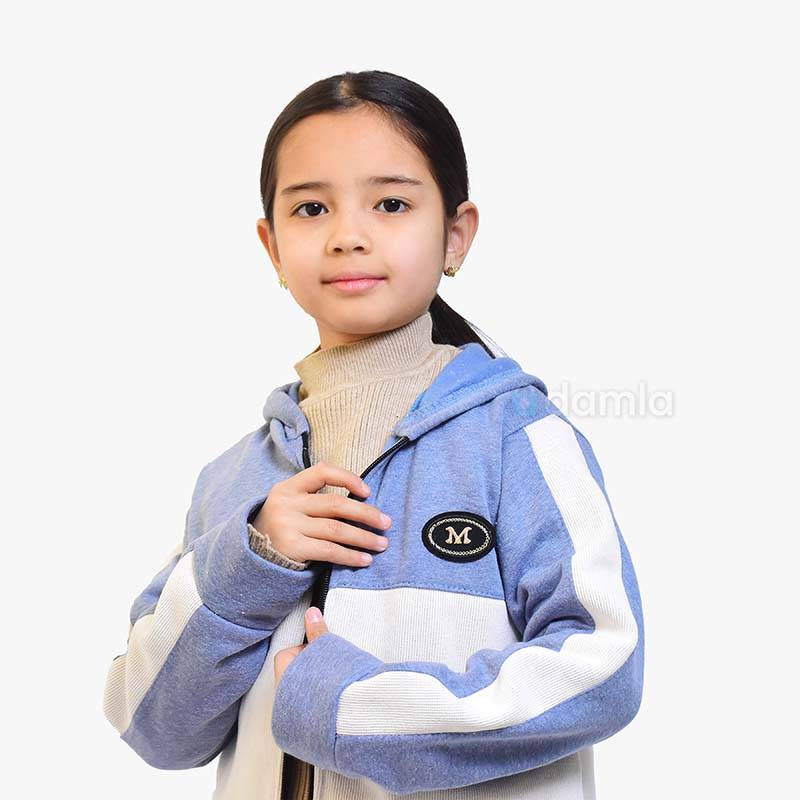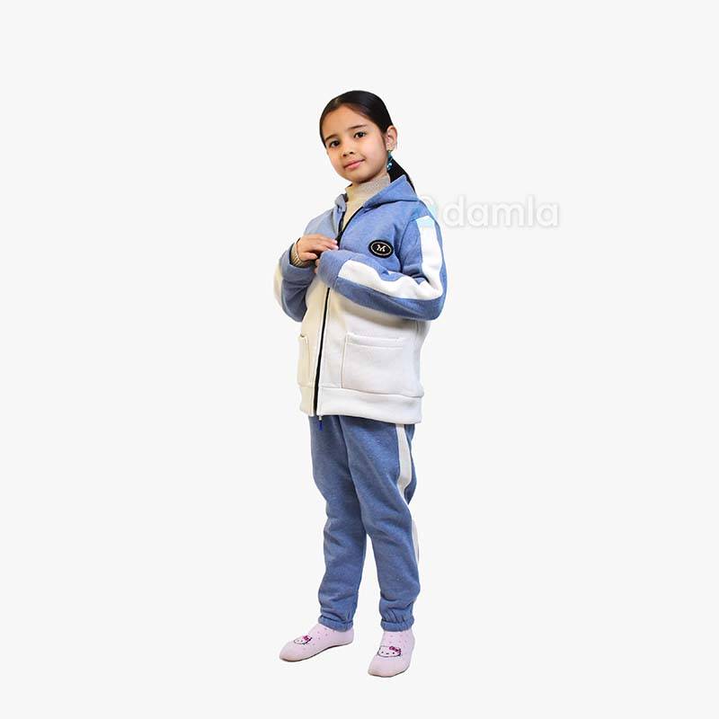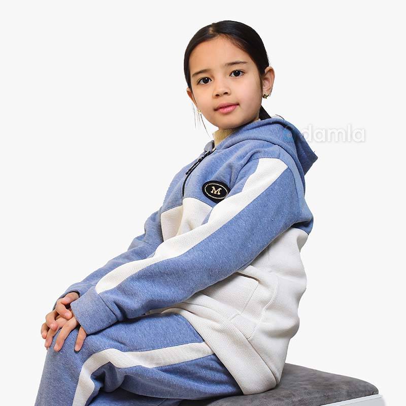 Gyz çagalar üçin süýt-açyk çal reňkli ýyly komplekt sport eşik- aýratynam sowuk howada çagalaryň şkafynyň aýrylmaz bir bölegidir. Açyk howada sport bilen meşgullanmak we salkyn bir otagda we gündelik ýolda pyýada ýörelende geýmek üçin amatly eşik. Adaty eşikden esasy tapawudy, sowuk howada rahatlygy we ýylylygy üpjün edýän gatlagynyň bolmagydyr. Zamokly we kapuşonly, döşünde "M" logotip bar. Sargytlar tassyklanandan soň 1-7 iş günüň dowamynda gowşurylar.