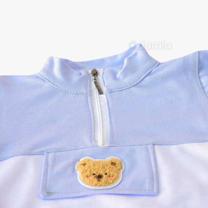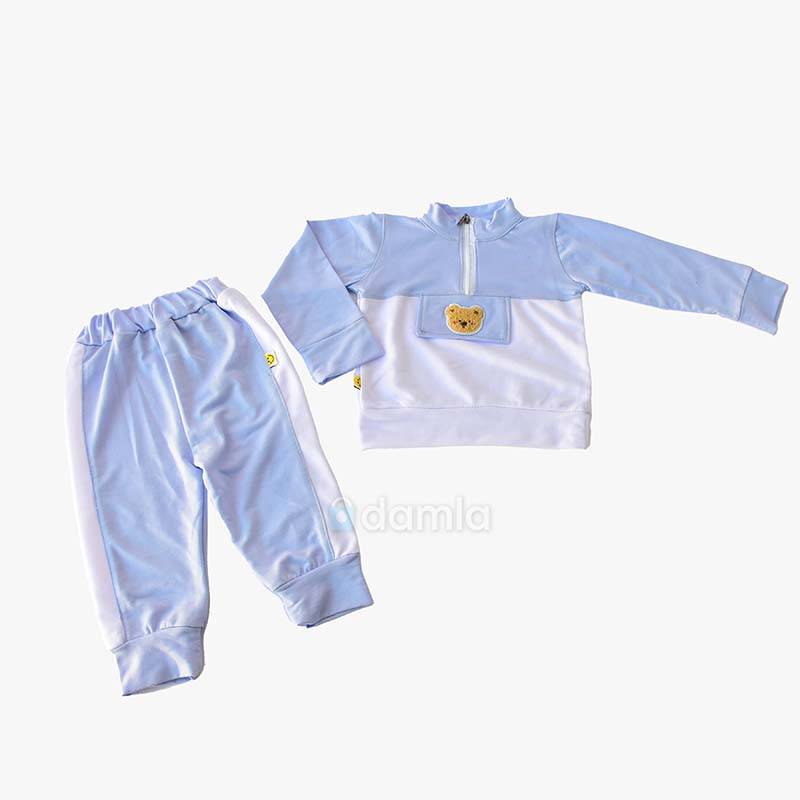 Gyz çagalar üçin ak - gök reňkli komplekt eşik -zamokly longsliw we balakdan ybarat bolup, sport bilen meşgullanan wagtyň, açyk meýdançada we gündelik geýmek üçin rahat we ýakymly, oňaýly çözgütdir. Ol rahatlygy we erkin hereket etmegi üpjün edýär. Ýüzi aýy şekilli.