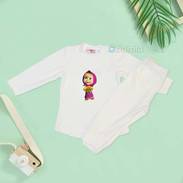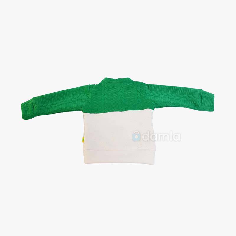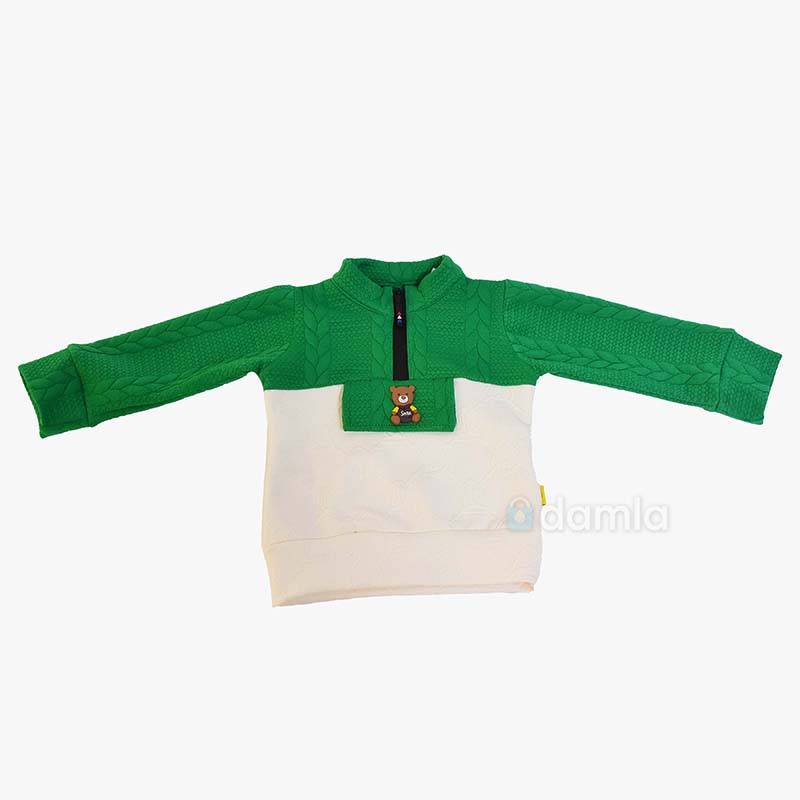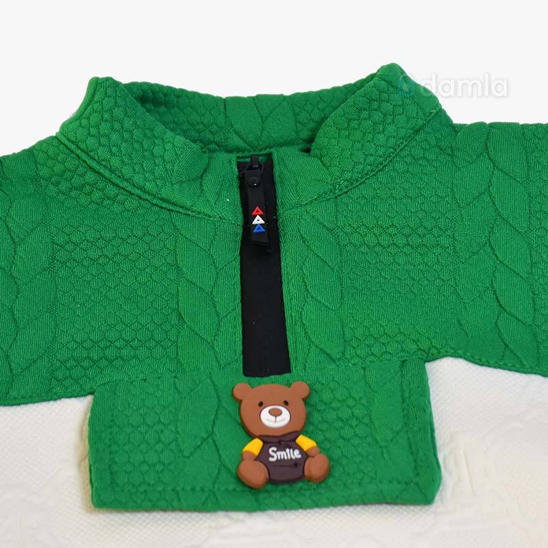Gyz çagalar üçin ak,ýaşyl reňkli komplekt eşik - zamokly longsliw we balakdan ybarat bolup, sport bilen meşgullanan wagtyň, açyk meýdançada we gündelik geýmek üçin rahat we ýakymly, oňaýly çözgütdir. Ol rahatlygy we erkin hereket etmegi üpjün edýär. Ýüzi aýy şekilli.