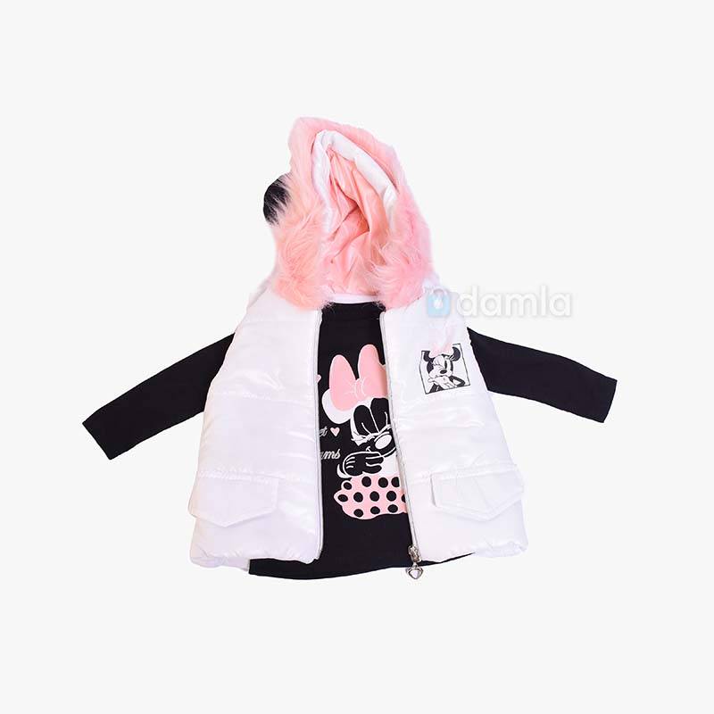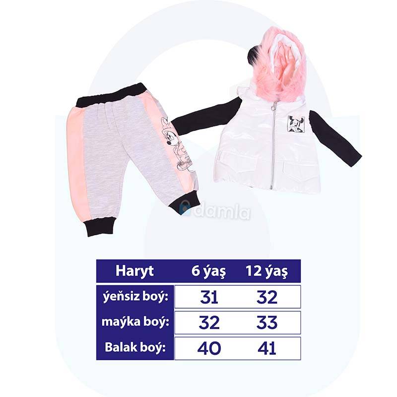 • Aýratynlyklary: Gyz çagalar üçin 3 li komplekt eşik. Toplumda ak reňkli kapuşonly ýeňsizi, uzyn ýeňli gara reňkli futbolkasy, çal reňkli balagy bar. Ýeňsiziň döşünde Mini Mouse şekili bar, futbolkasy Sweet dreamers ýazgyly, balagy çal reňkli suratly. Bu eşik endama ýakmly we rahat bolmagy ony islendik ýagdaýlarda geýmäge mümkinçilik berýär.