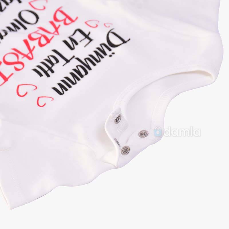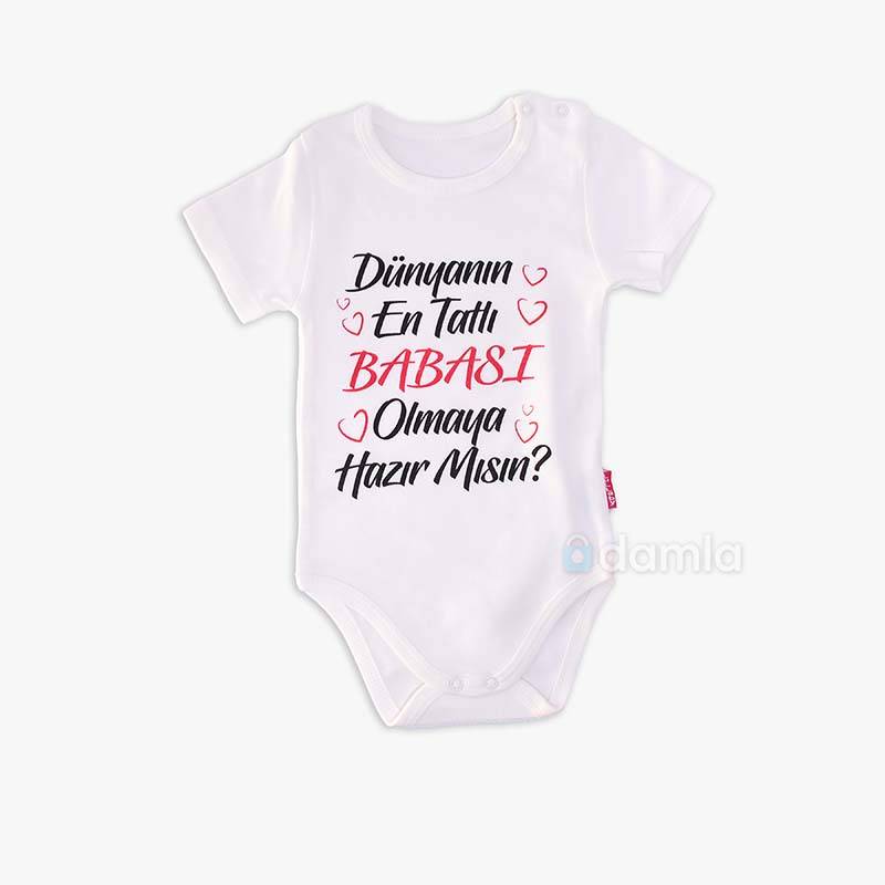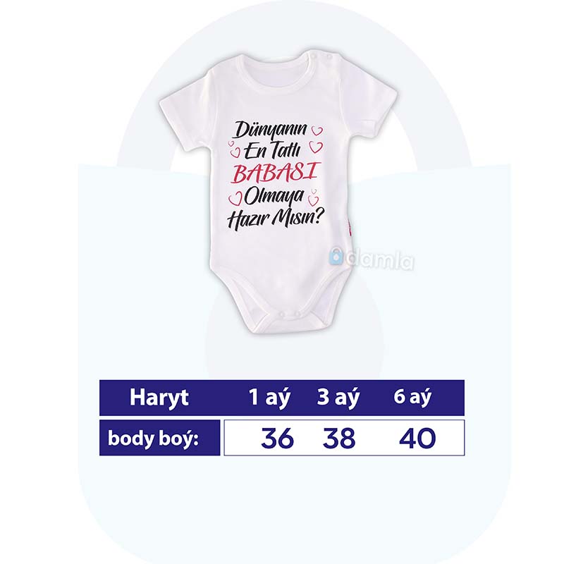 • Aýratynlyklary: Dünyanin En Tatli BABASI Olmaya Hazir Misin? ýazgyly hem ak reňkli Bäbekler üçin bodi - içki eşikleriň bir görnüşidir. Aşakda knopka bilen berkidýärler, bu bolsa pampersini çalyşmagy amatly edýär we eşikleriň ýokary galmagynyň öňüni alýar.