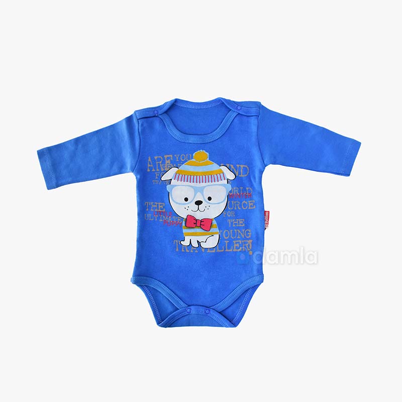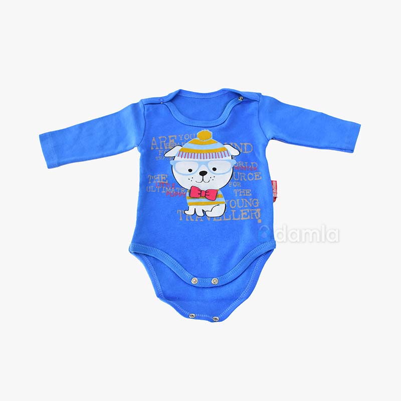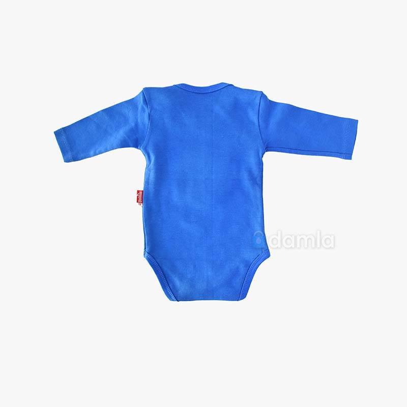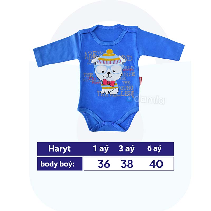 • Aýratynlyklary: Bäbekler üçin gök reňkli güjüjek suratly hem ýazgyly bodi - içki eşikleriň bir görnüşidir. Aşakda knopka bilen berkidýärler, bu bolsa pampersini çalyşmagy amatly edýär we eşikleriň ýokary galmagynyň öňüni alýar.