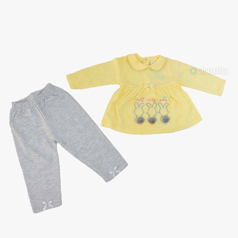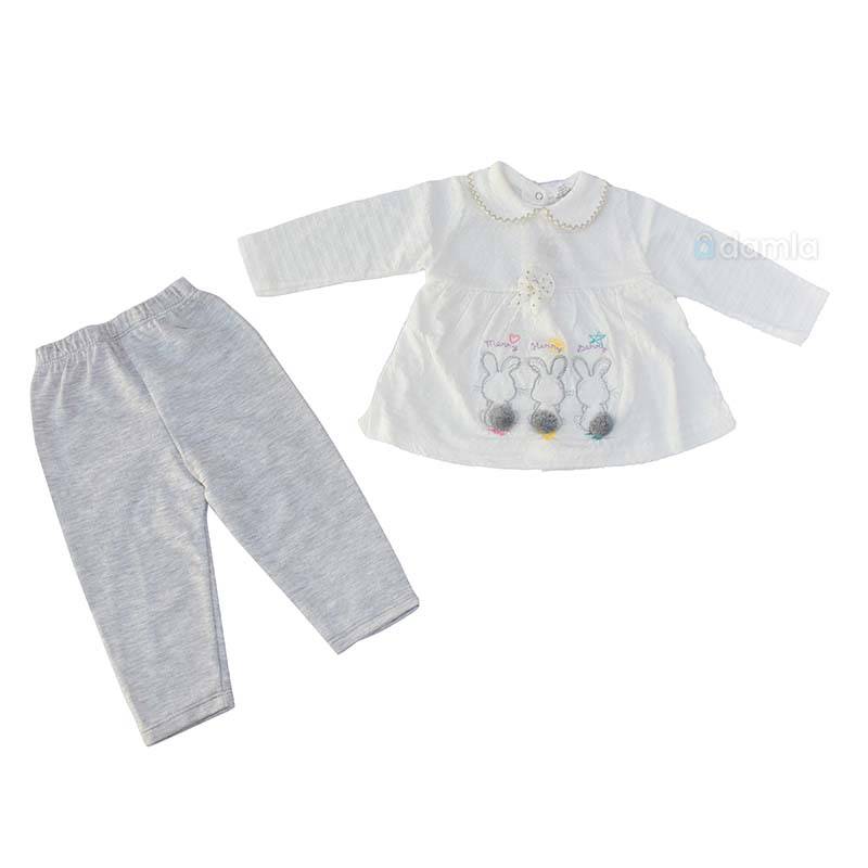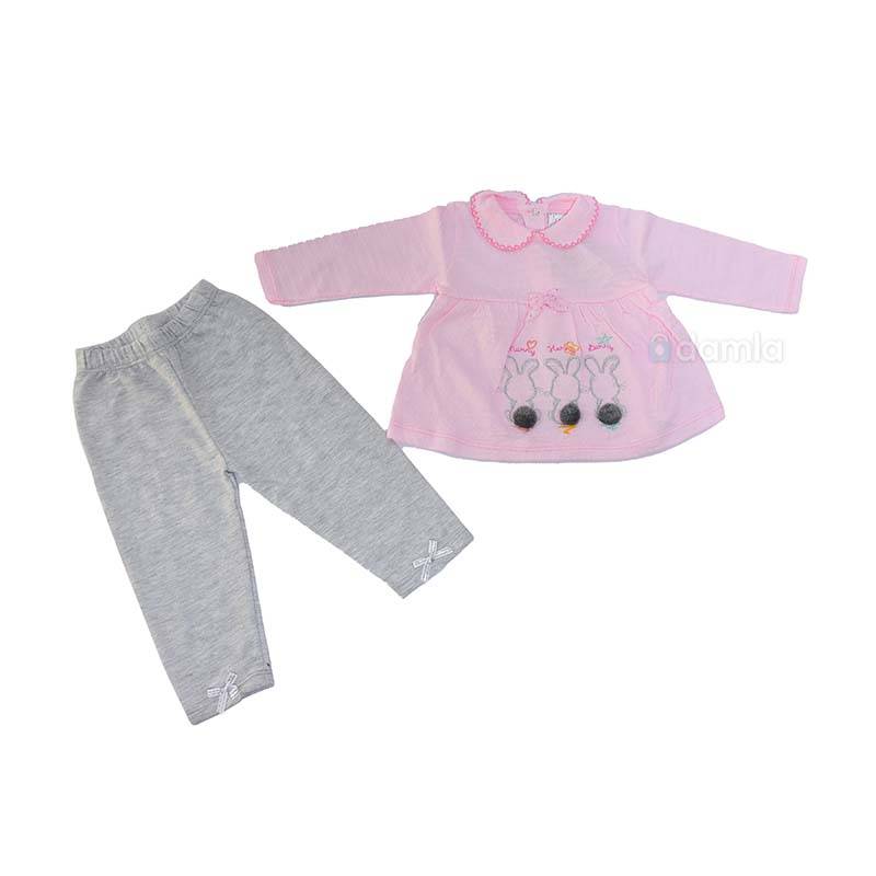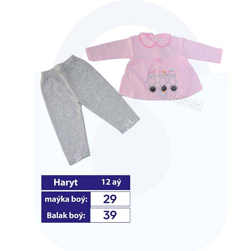 • Ayratynlyklary: Çaga üçin ajaýyp 2 li toplum, gapma-garşylykly çal balakly gülgüne knopkaly köýnekden ybarat. Köýnegiň ýüzünde 3 sany towşanjygyň suraty bar.Köýnek knopka bilen ýapylýar we balagyň ýumşak materially çaga üçin rahatlygy üpjün eder. Gündelik gezelençler üçin iň amatly saýlaw.