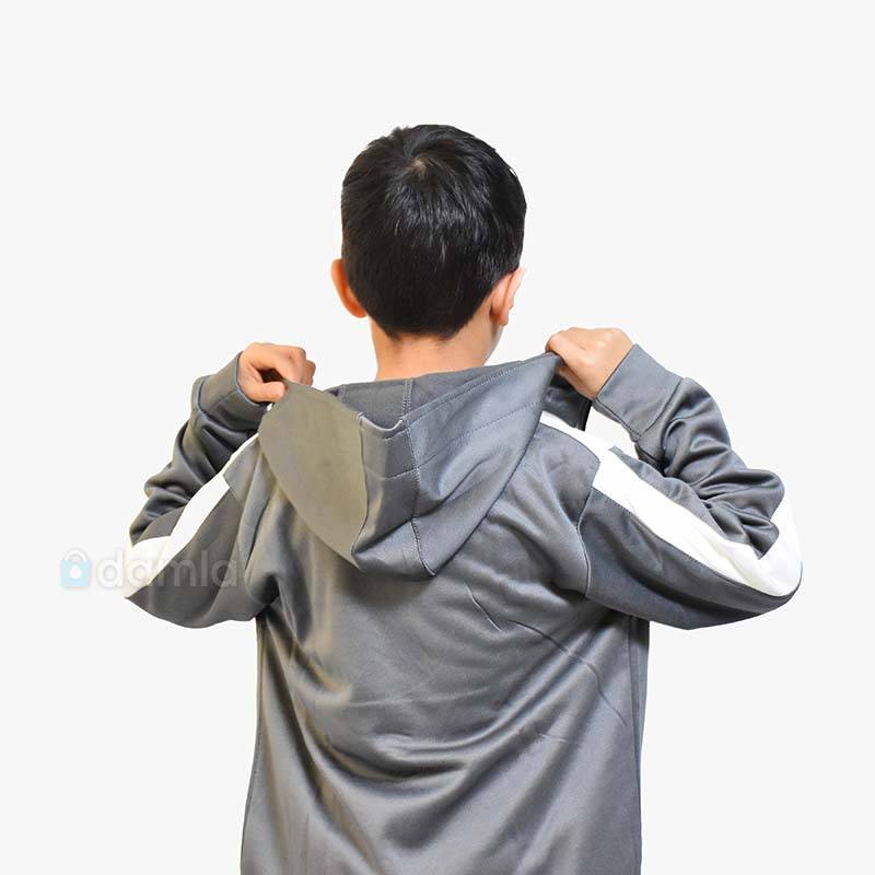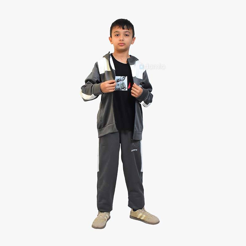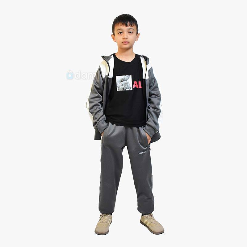• Aýratynlyklary: Oglan çagalar üçin çal-süýt reňkli komplekt sport eşik - işjeň çagalar üçin zamokly we jübüli sportiwka we bili rezinli we ýazgyly balakdan ybarat. Salkyn howada geýmek üçin ýeňil we rahat eşik.