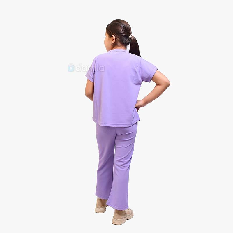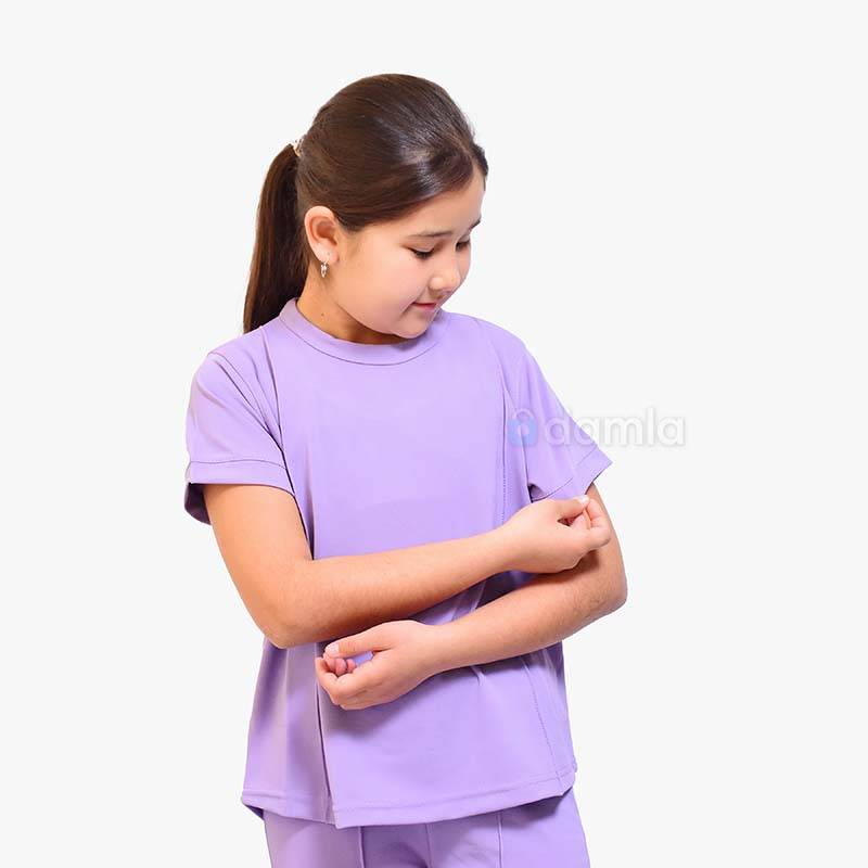 • Aýratynlyklary: Gyz çagalar üçin mawy reňkli komplekt eşik - işjeň çagalar üçin kelte ýeňli, tegelek ýakaly futbolka we bili rezinli balakdan ybarat. Futbolka we balagyň ýüzünde tikinleri ýüzüne çykyp duran (rebristyý) fason edilen. Salkyn howada geýmek üçin ýeňil we rahat eşik.