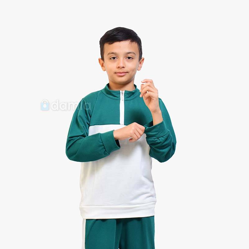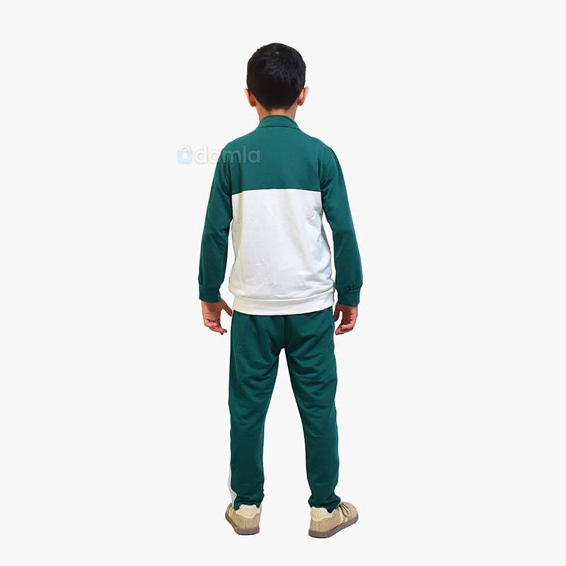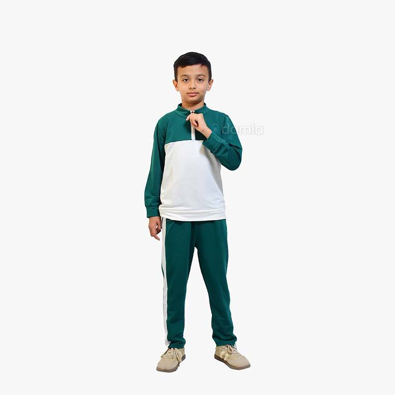 • Aýratynlyklary: Oglan çagalar üçin goýy ýaşyl-ak reňkli komplekt eşik - işjeň çagalar üçin döşe çenli zamokly, uzyn ýeňli sportiwkasy hem bili rezinli balakdan ybarat. Salkyn howada geýmek üçin ýeňil we rahat eşik.