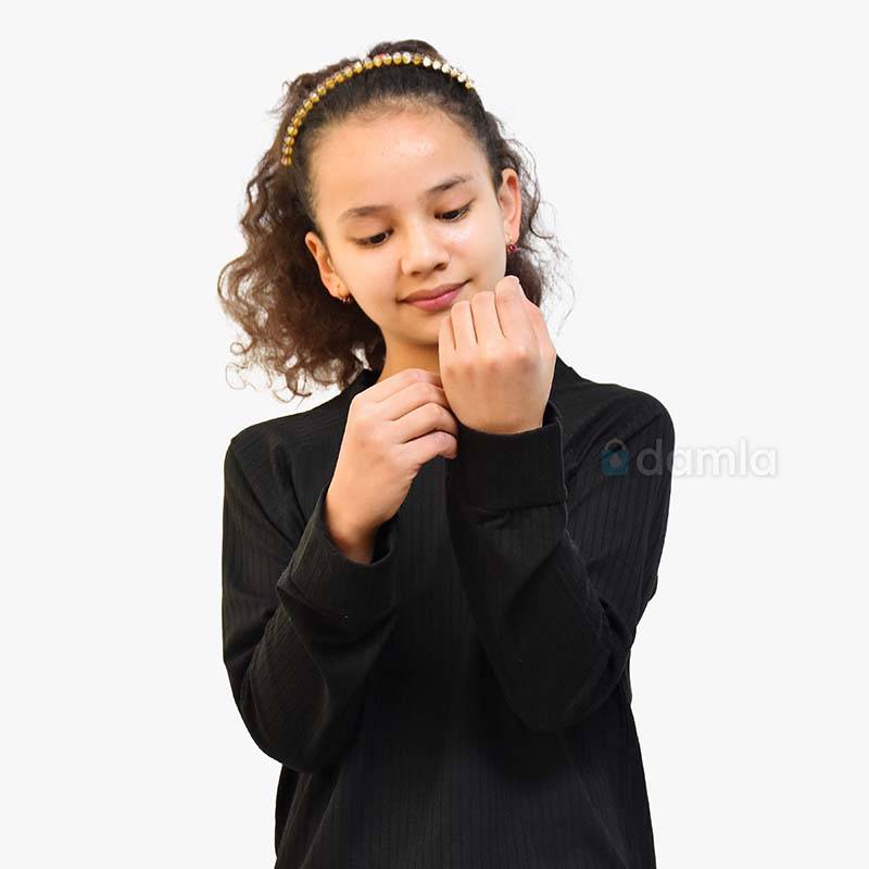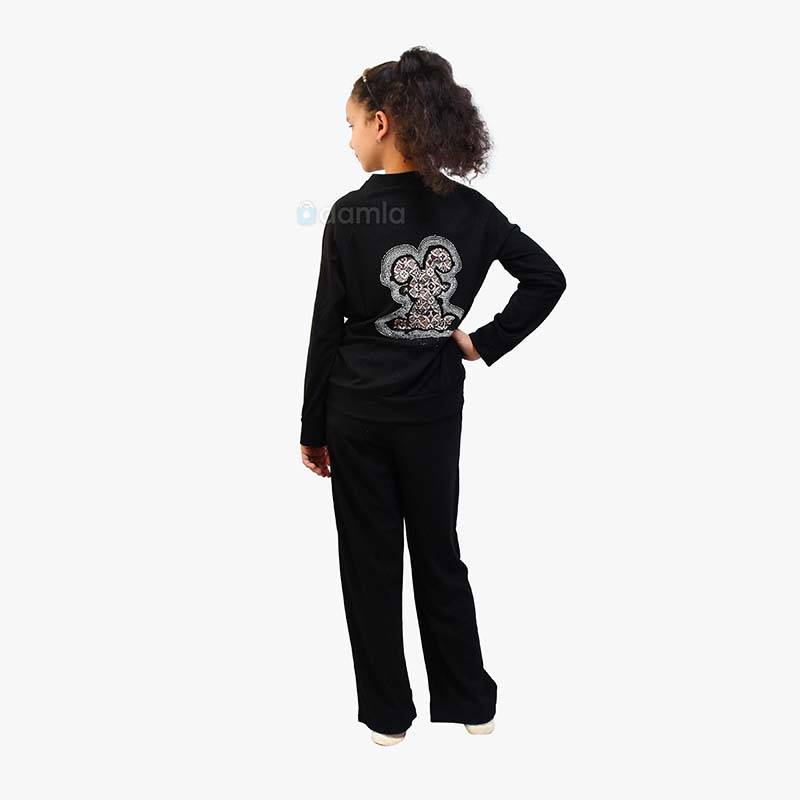 • Aýratynlyklary: Gyz çagalar üçin gara reňkli komplekt eşik, tegelek ýakaly uzyn reglan fasonly ýeňli hem döşi towşan şekilli futbolkasy we bili rezinli balagy bar. Ýumşak matasy we rahat biçüwi ony gündelik geýmek üçin ajaýyp saýlaw edýär. Arkasynda surat bar.