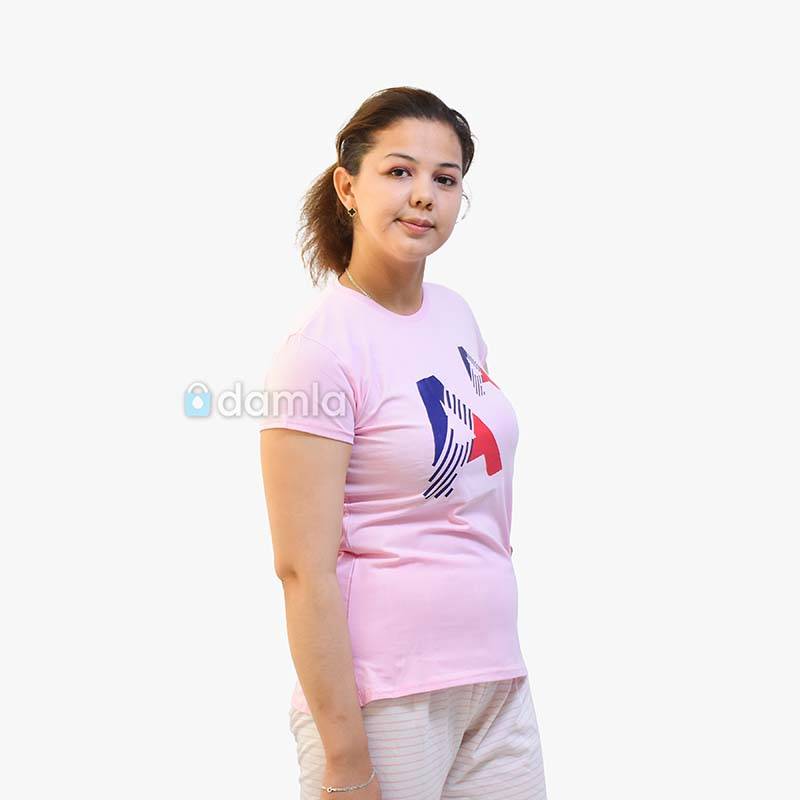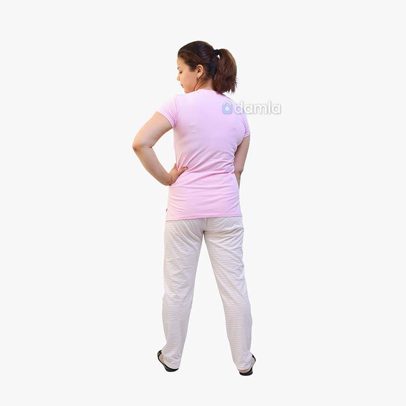 • Aýratynlyklary: Zenanlar üçin gülgüne reňkli pižama ýumşak we dem alýan pagta materialdan tikilen. Kelte ýeňli futbolka ýumşak we A harply şekili bilen bezelen. Balakda oňaýly bolmagy üçin reziny we gülgüne çyzyklar bilen bezelen. Öýde rahat uky we dynç almak üçin amatly.