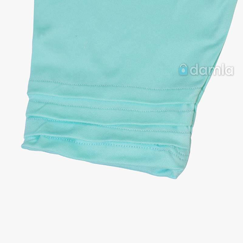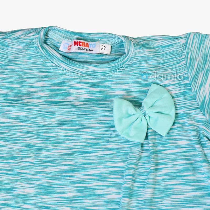 • Aýratynlyklary: Gyz çagalar üçin açyk gök reňkli komplekt eşik. Kelte ýeňli, tegelek ýakaly, futbolka. Futbolkanyň ýüzi bantik bilen bezelen. Bili rezinli, şortigyň aşagy tikin geçirilip bezelen. Gündelik geýmek üçin rahat we ajaýyp saýlaw.