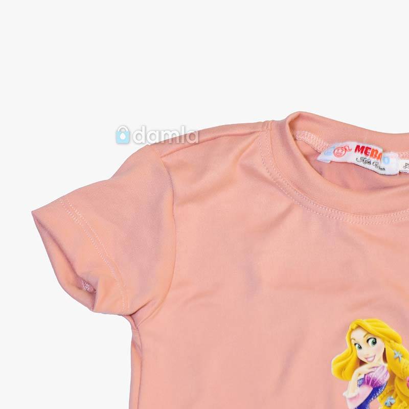 • Aýratynlyklary: Gyz çagalar üçin goýy bežewyý reňkli komplekt eşik. Kelte ýeňli, tegelek ýakaly futbolka. Futbolkanyň ýüzünde "Rapunzel" multfilimindäki uzyn saçly Şa gyzynyň şekili bilen bezelen. Bili rezinli şortik. Gündelik geýmek üçin rahat we ajaýyp saýlaw.