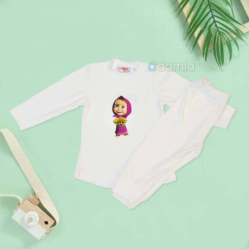 • Aýratynlyklary: Gyz çagalar üçin ak reňkli komplekt eşik. Uzyn ýeňli, tegelek ýakaly, arkasy uzyn futbolka. Futbolkanyň ýüzünde "Maşa we aýy" multiifilimindäki Maşanyň şekili bilen bezelen. Bili rezinli balak. Gündelik geýmek üçin rahat we ajaýyp saýlaw.
