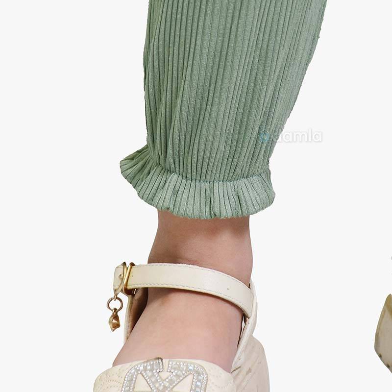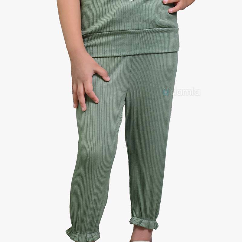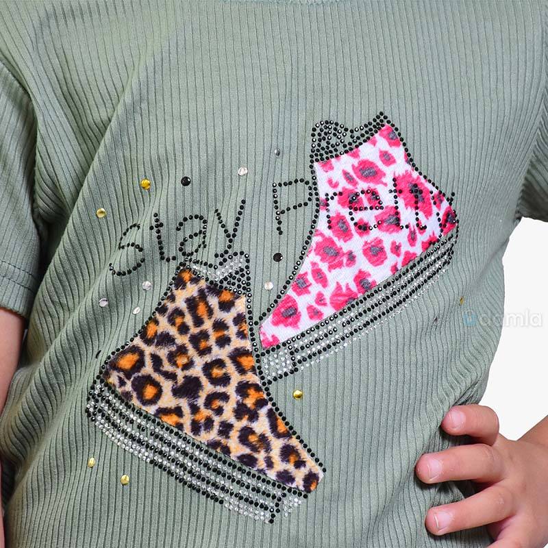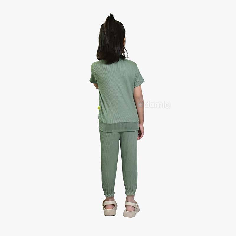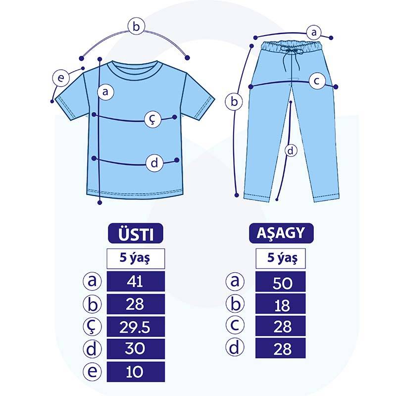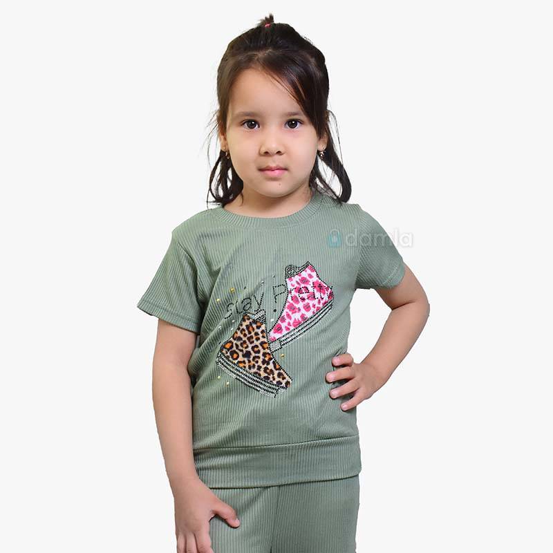 • Aýratynlyklary: Gyz çagalar üçin haki reňkli komplekt eşik. Kelte ýeňli, tegelek ýakaly, futbolka. Futbolkanyň ýüzünde gaşlar we şekiller bilen bezelen. Bili rezinli, ak lentaly, aşagy rezinli balak. Gündelik geýmek üçin rahat we ajaýyp saýlaw.