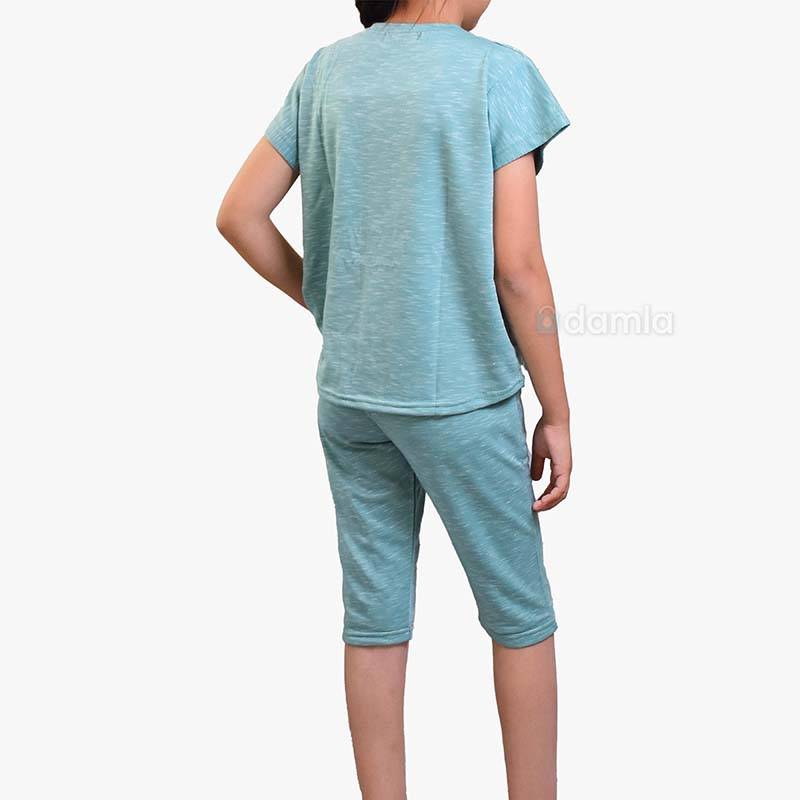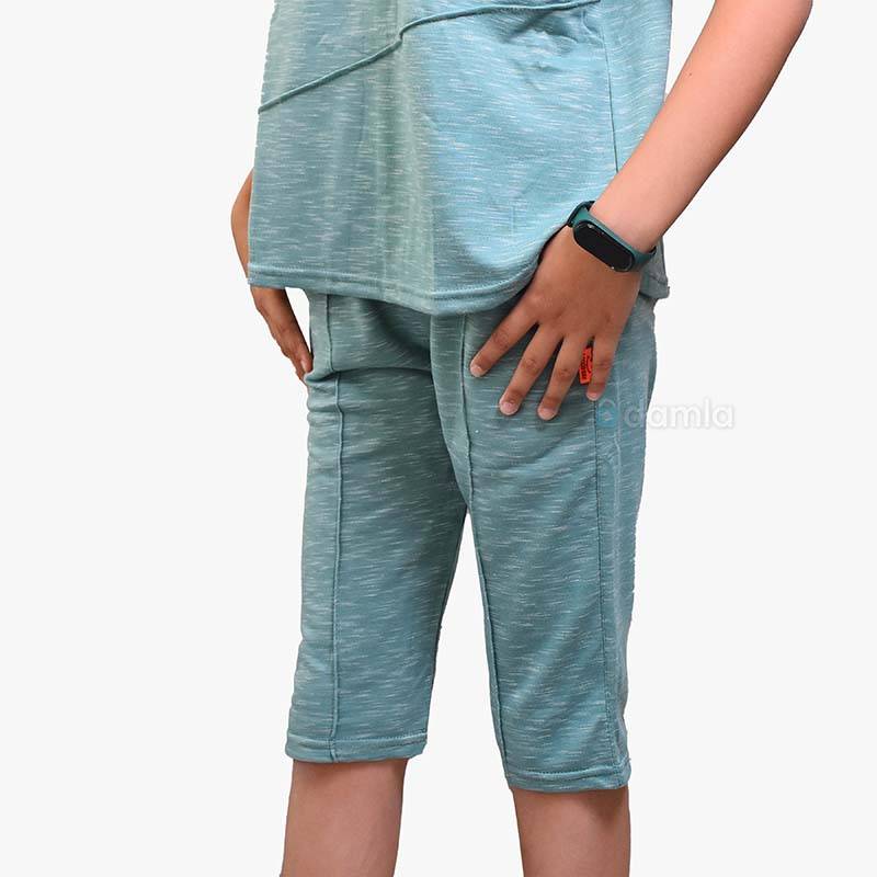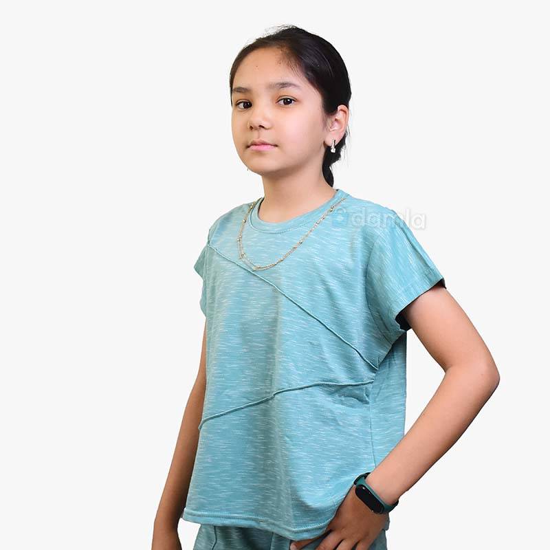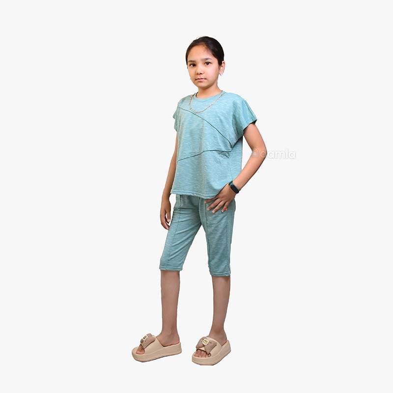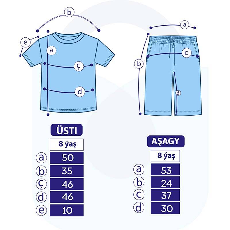 • Aýratynlyklary: Gyz çagalar üçin açyk gök reňkli komplekt eşik. Kelte ýeňli, tegelek ýakaly we ýakasynda zynjyr bilen bezelen futbolka. Futbolkanyň ýüzünden tikin bilen bezelen. Bili rezinli, ýüzünden tikin bilen bezelen şortik. Gündelik geýmek üçin rahat we ajaýyp saýlaw.