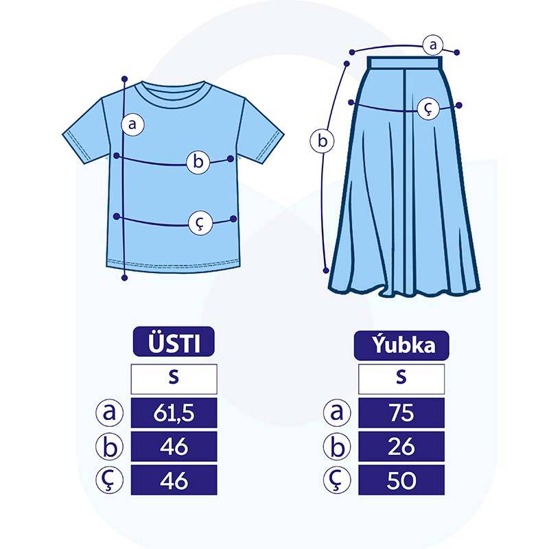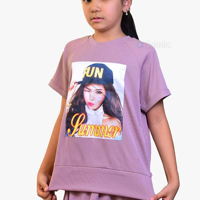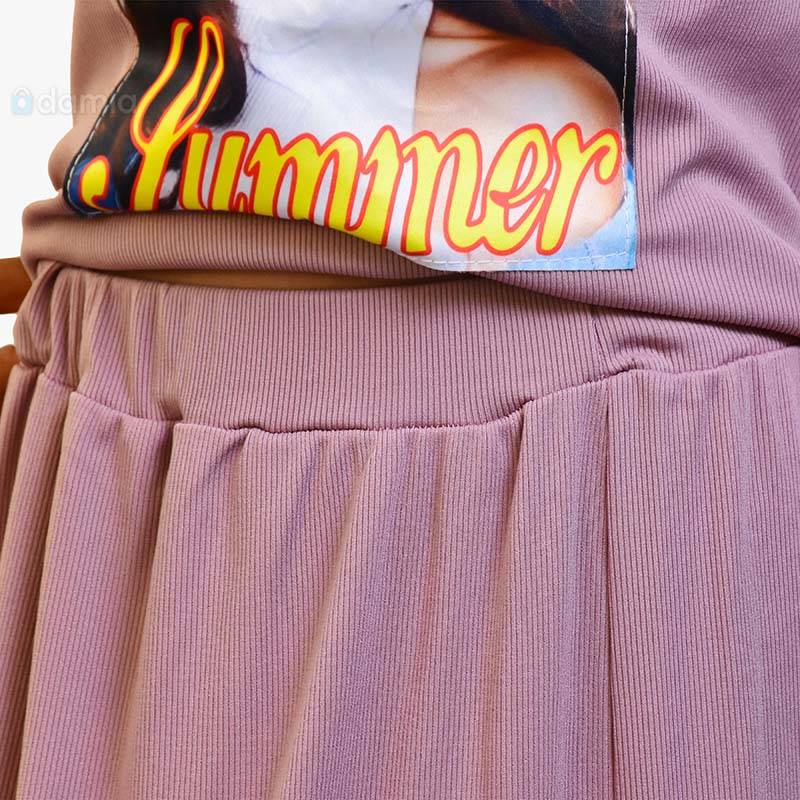 • Aýratynlyklary: Gyzlaryň tomusky komplekt eşigi, yssy tomus üçin iň amatly warianty dem alýan materialdan tikilýär. Kelte ýeňli, açyk mawy reňkli futbolka we ýubka, yssy günüň aşagynda size kömek eder. Futbolkanyň ýüzünde owadan gyzyň suraty bilen bezelen. Ýubkanyň bili rezinli. Dynç alyşda we gündelik geýmek üçin rahat hem ykjam we amatly eşik.