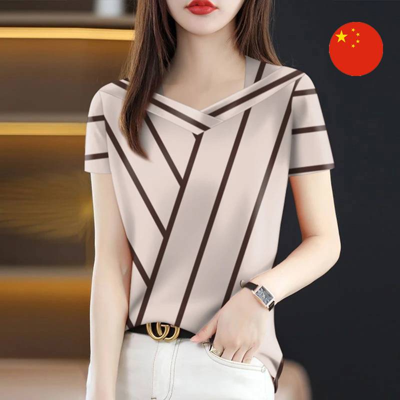 • Aýratynlyklary: Gara reňkli bluzka. Kelte ýeňli, gara reňkiň üstündäki ak çyzyklar dinamiki we unudylmajak keşp döredýär. Üýtgeşik, gat-gatly V-şekilli ýakasy bu bluzka aýratyn nepislik we stil berýär.