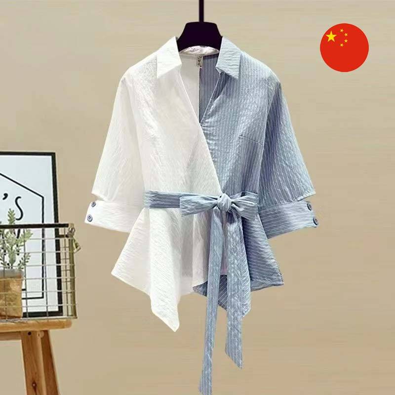 • Aýratynlyklary: Zenanlar üçin köýnek asman näzik gök zolak bilen birleşdirip, assimetrik dizaýnda ýasalýar. Modeliň V boýny, kelte ýeňleri we assimetrik gyrasy bar. Ýörite aýratynlyk, bili nygtaýan we zenan siluetini döredýän bant bilen baglanyşýan giň guşakdyr. Bu bluzka gündelik ýa-da ofis stili üçin amatly aksent bolar.