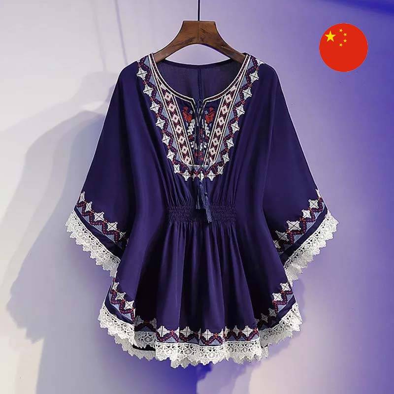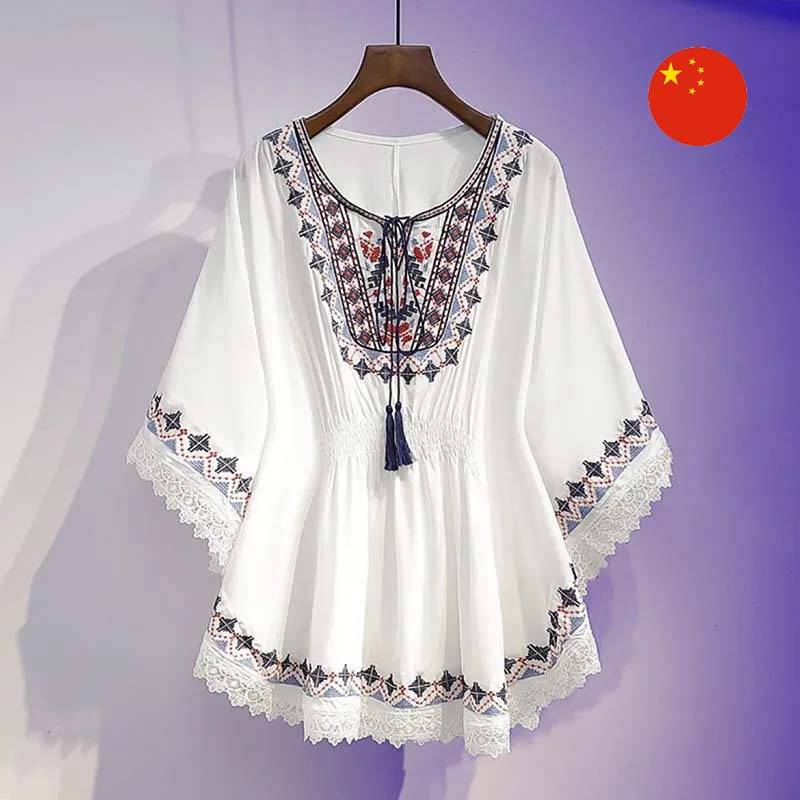 • Aýratynlyklary: Zenanlar üçin köýnek açyk we howaly şekil döredýän näzik ak reňkde ýasalan. Boýnundaky we ýeňlerdäki açyk etnik keşdeler, moda bogemiň özüne çekijiligini berýär. V-boýny kružawalar bilen bezelen, ýeňleri näzik ak kružawa bilen bezelendir. Boş kesilen we dakylýan bil bagy oňaýly laýyklygy üpjün edýär we aýallyk aýratynlygyny görkezýär.