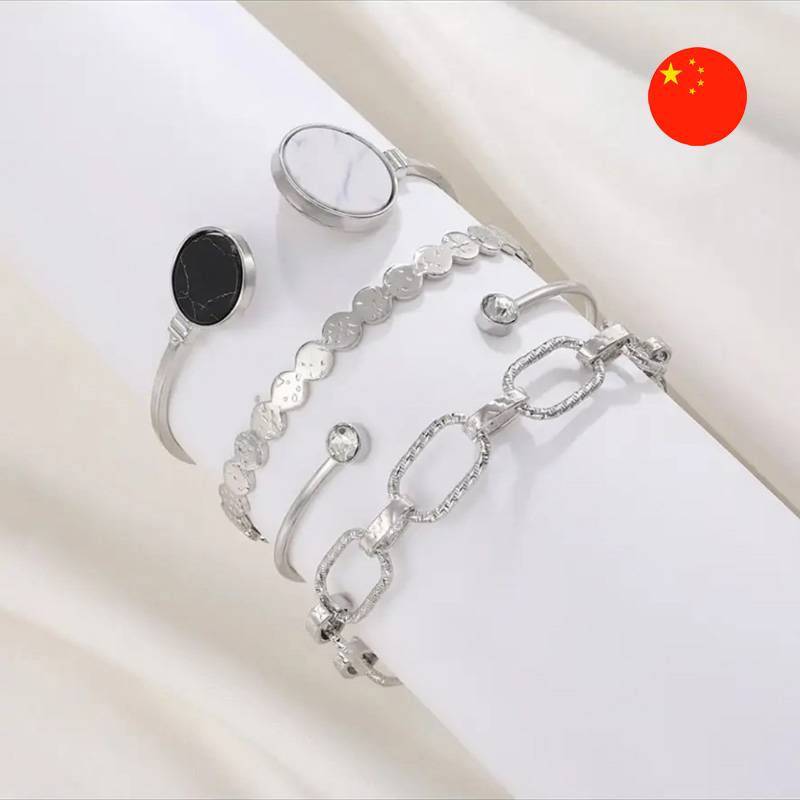 • Aýratynlyklary: Dört sany kümüş bilezik. Ilkinji bilezik iki dürli görnüşli tabak bilen bezelen çeňňek bilezikdir. Ikinji tabak tegelek, gara daş bilen. Ikinji bilezik, teňňe görnüşli maýatnikli inçe zynjyrdyr.