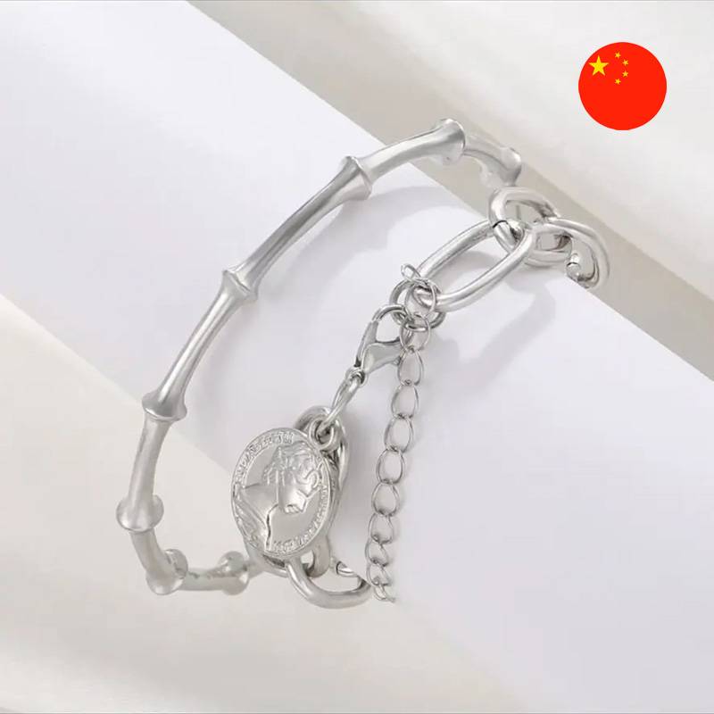 • Aýratynlyklary: Iki sany altyn bilezik. Biri bambukdan nusga alýan bilezik. Ikinjisi, gadymy teňňe görnüşinde maýatnik asylýan uly baglanyşyklary bolan ullakan zynjyrdyr.