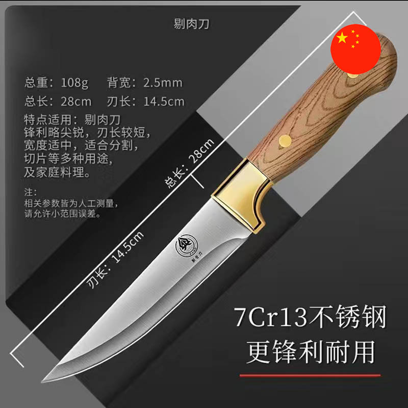 • Aýratynlyklary: Eti kesmek we bezemek üçin niýetlenen ýiti pyçak köpugurly aşhana pyçagy. 7Cr13 ýokary hilli poslamaýan polatdan ýasalan, gaty ýiti we çydamly. Tutga amatlylygy we ygtybarlylygy üpjün edip, tebigy agaçdan ýasalýar.