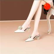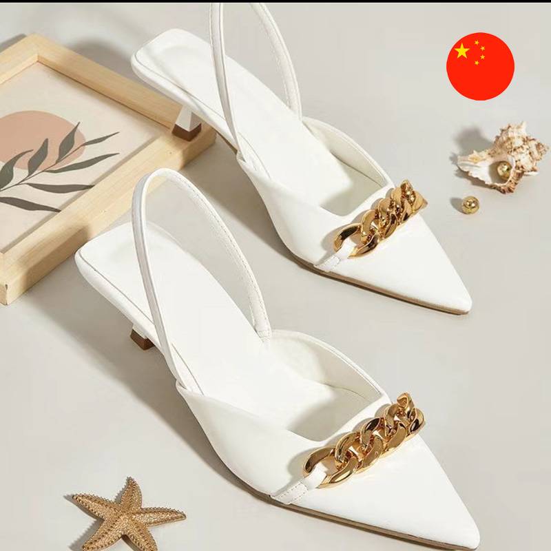 • Aýratynlyklary: Ýiti burunly we açyk ökjeli, gara reňkdäki stil we zenan köwüşleri. Pes, durnukly "rümoçka" şekilli ökje günuzyn rahatlygy üpjün edýär. Burunjygyndaky altyn reňkli bezeg zynjyry oňa aýratynlyk goşýar. Tämiz we moda laýyk tomusky keşp döretmek üçin ajaýyp saýlaw.
