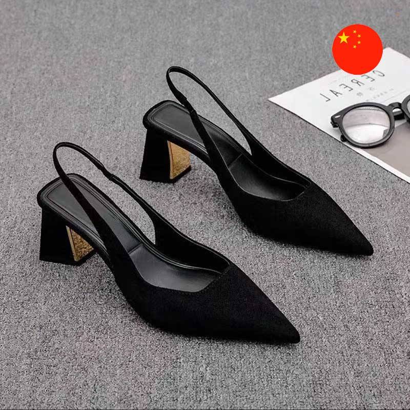 • Aýratynlyklary: Ýiti burunly, gara reňkdäki elegant zenan köwüşleri. Altyn reňkli elementi bolan durnukly kwadrat ökje rahatlygy üpjün edýär we modele nepislik berýär. Inçe gaýyşly açyk ökjesi olary ýyly möwsümler üçin ideal edýär. Ofis üçin hem, agşamky çäreler üçin hem ajaýyp saýlaw.