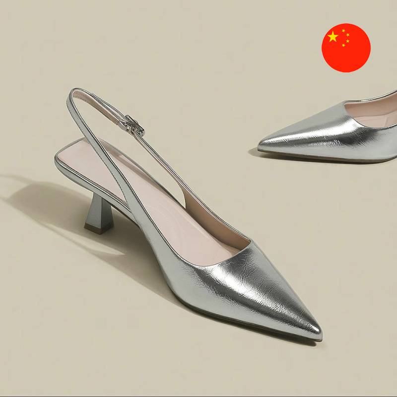 Aýratynlyklary: Ýalpyldawuk, kümüş reňkdäki stil slingbek köwüşleri. Ýiti burunly, durnukly «rümoçka» şekilli ökjeli we burnunda uly metal tokaly model. Yzky gaýyş aýagy ygtybarly saklaýar. Agşamky gezelenç, baýramçylyk ýa-da aýdyň gündelik keşbi döretmek üçin ajaýyp saýlaw.
