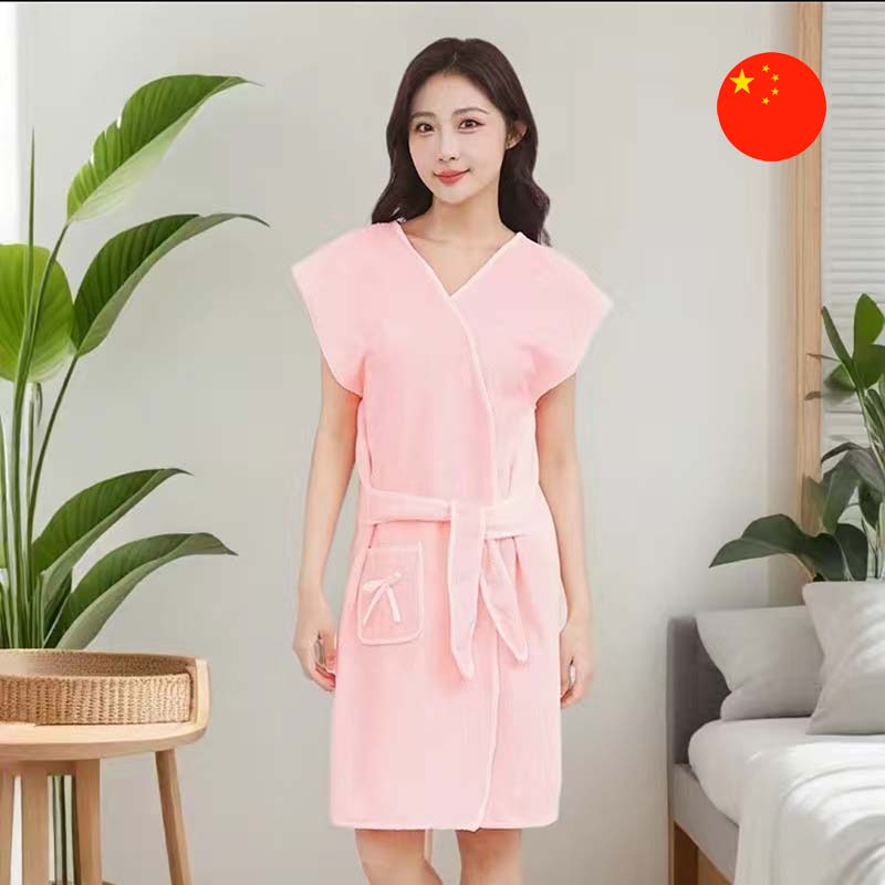 Aýratynlyklary: Ýumşak matadan tikilen kelte halat. Model, gyrasy boýunça gapma-garşylykly bezeg bilen näzik reňkde ýasalýar. Egin-eşigiň gysga ýeňleri, kemeri we iki gapdaly jübüsi bar, bu bolsa duşdan soň ýa-da öý eşigi hökmünde ulanmagy amatly edýär.