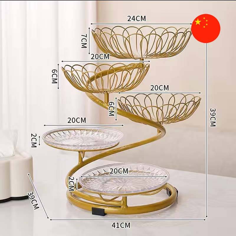 Aýratynlyklary: Bu bezeg miweli jam, islendik ajaýyp goşundy bolar. Bäş derejeden ybarat: metal sebet görnüşindäki üç gatlak we aýna tabaklar görnüşindäki iki gatlak. Baýram stolunda miweleri, süýjüleri ýa-da köke önümlerini hödürlemek üçin ajaýyp.