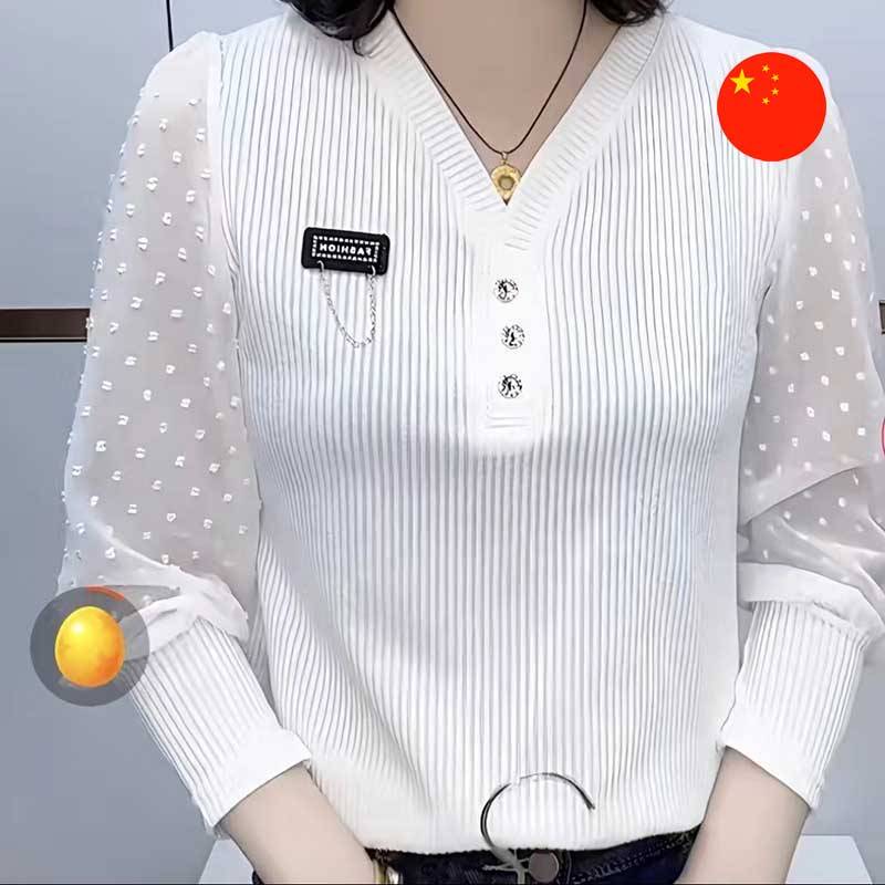 • Aýratynlyklary: Rahatlygy we çylşyrymly dizaýny birleşdirýän zenan bluzka. Esasy bölegi inçe ýumşak trikotaž önümlerinden ýasalýar. Ýeňleri nokat nagşy bilen prozraçnyý şifondan ýasalyp, howany we özüne çekijiligi goşýar. V-ýaka we owadan ilikleri ýakanyň çyzgysyny görkezýär, döşündäki kiçijik nyşan bolsa häzirki zaman täsirini goşýar.