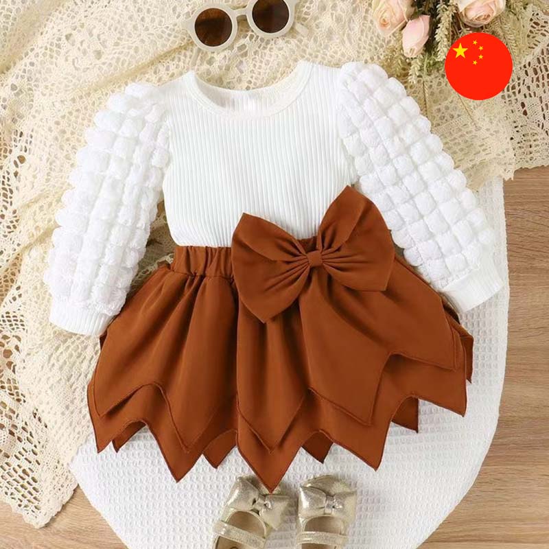 • Aýratynlyklary: Bu özüne çekiji komplekt eşik baýramçylyk dabaralary we fotosessiýalar üçin iň oňat saýlaw. Ol göwrümli giň ýeňli bodiden we üýtgeşik biçüwli ýubkadan ybaratdyr. Bilindäki uly bantik keşbe nepislik goşýar. Bu geýim örän meňzeşi ýok we näzik görkezýär.