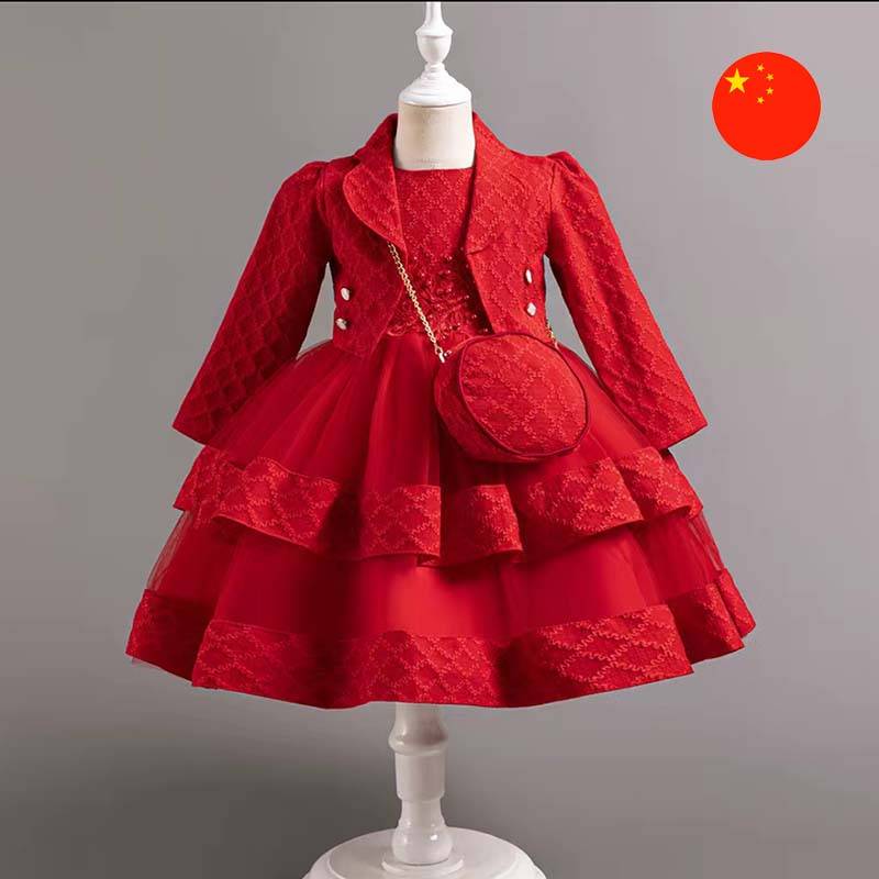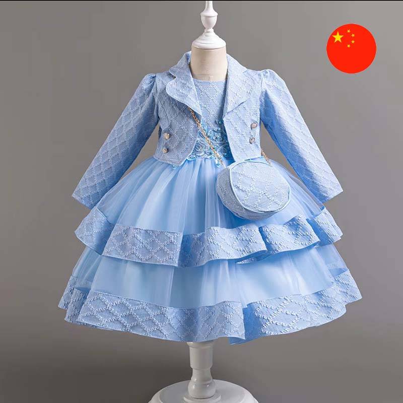 Aýratynlyklary: Goýy reňkdäki çagalar üçin komlekt. Islendik dabara üçin iň oňat saýlawdyr. Ol köp gatlakly köýnekden, döwrebap gysgaldylan žaketdan we zynjyrly kiçijik sumkadan ybaratdyr. Bu geýim hakyky şa gyzynyň keşbini döredip, örän nepis we kaşaň görkezer.