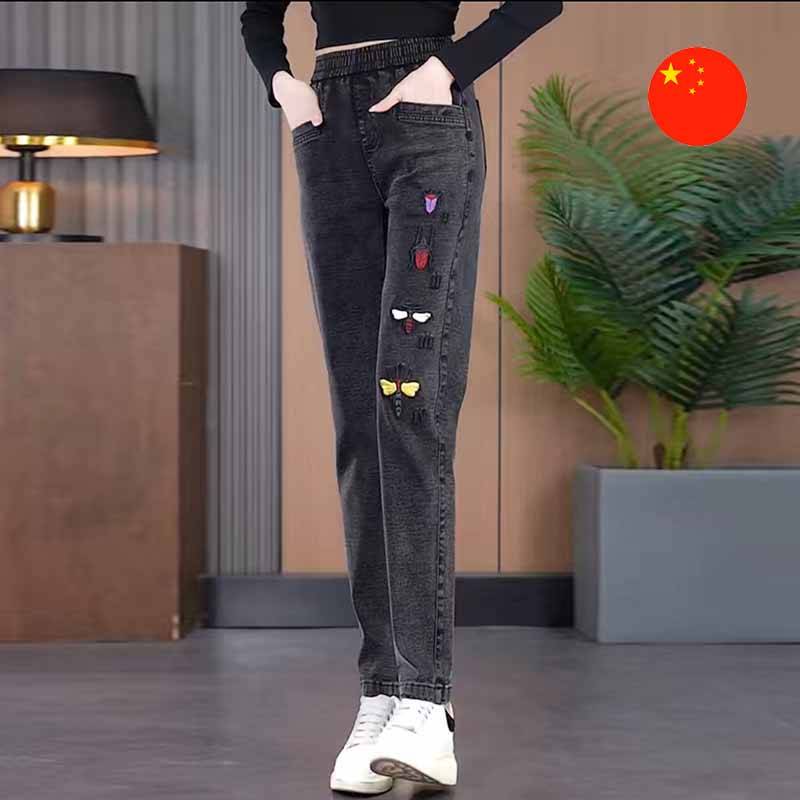 • Aýratynlyklary: Stilili we rahat, göni biçüwli kroýly jinsiler. Iň ýokary amatlylyk üçin elastiki bil bilen orta beýiklikdäki model. Esasy ünsi çekýän zat — jinsiniň bir aýagynyň üstünde stilize edilen gözler görnüşinde ýerine ýetirilen ýagty, köp reňkli öekiller bar.