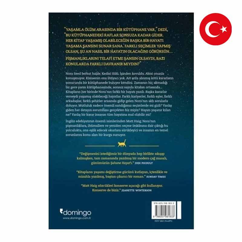 • Aýratynlyklary: Eger durmuş bilen ölüm arasynda kitaphananyň bardygyny hasap etsek näme? Bu kitaphanada bolsa tekjelerde kitaplar duran, olaryň her biri — başga bir durmuşy synap görmek üçin mümkinçilik, başga saýlaw eden bolsaňyz ýaşap biljek durmuşyňyz. Ýyldyzly asman we syrly öý bilen bezelen daşlygyň aňyrsynda bir zenanyň saýlap almadyk ähli durmuşlaryny ýaşap görmäge mümkinçilik alandygy baradaky taryh gizlenýär. Oňa hakykatdanam özüne laýyk gelýänini tapmaga ýeterlik batyrlygy barmyka?