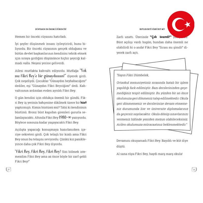 • Aýratynlyklary: "Dünyanın En Önemli Öğrencisi" – meşhur türk ýazyjysy Sеrmin Ýaşaryň gülkünç we öwrediji çagalar kitabydyr. Ähtimal, bu kitap okuwçylaryň diňe passiw oturyp diňlemäge mejbur edilýän köne we netijesiz bilim usullaryny ýaňsylaýar. Wakanyň özeni, hasap edilişi ýaly, synpda "iň möhüm" okuwçynyň peýda bolmagy bilen gurulýandyr, bu ýagdaý ähli adamlary okuw wagtynda okuwçynyň roluna we ornuna üns bermäge mejbur edýär.