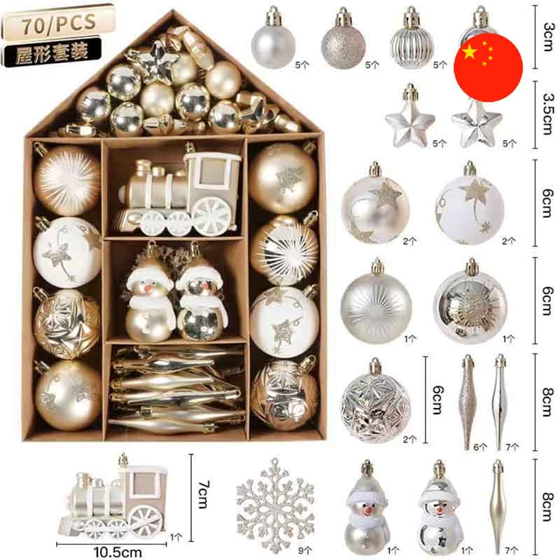 • Aýratynlyklary: Täze ýyl arçasy üçin iň uly we iň baý görnüşi dörediň! Altyn (GOLD) reňkli 70 sany dürli we owadan baýramçylyk bezeglerinden ybarat bu toplum, öýüňize şatlyk we kaşaňlyk duýgusyny getirýär. Bezegler öý şekilli, bölünen aýratyn gutuda gelýär. Bu olary aňsat saklamaga we başga bir sowgat hökmünde ulanmaga mümkinçilik berýär.